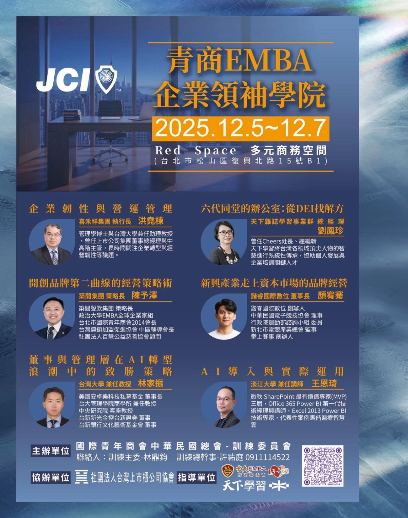 ✨這次課程,除了由青商會籌備規劃,我們榮幸邀請到最具商業影響力的台灣上市櫃公司協會作為協辦單位。還有培育最多企業領袖的台大EMBA校友基金會,以及天下學習集團作為指導單位,為我們提供最堅強的師資及意見!